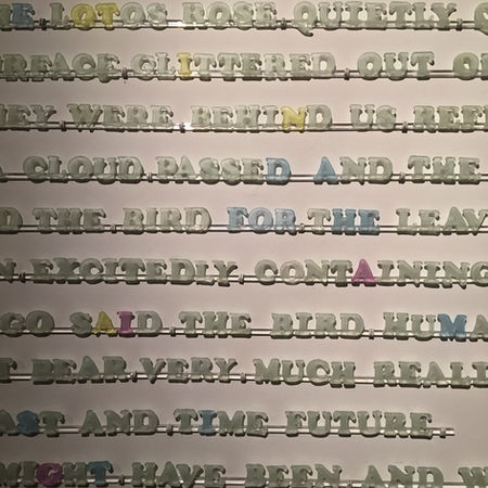 The poem is the first part of TS Eliot’s Burnt Norton from his book Four Quartets. Hidden inside, like and encrypted message, you can read (following the colors, Pink, Blue and Yellow, consecutively) a part of the song Space Oddity by David Bowie.